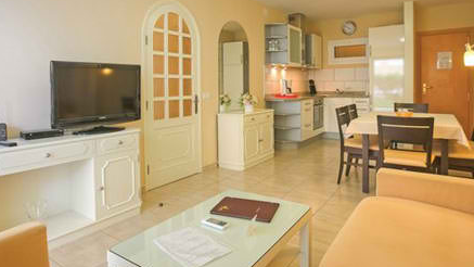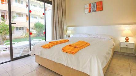 The well-decorated units, each with balcony or garden terrace, are all set beside the resort's large swimming pool. All units have a full kitchen, microwave, and telephone service. one-bedroom units accommodate up to four adults and children, while two-bedroom units are available for up to six.